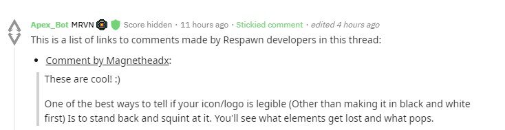 N-10 alkotásait imádta a Reddit közösség, mindegyik logó kiválóan érzékelteti az adott karakter vonásait. Octane, Wraith, Pathfinder, Gibraltar, Caustic és Bloodhound egyaránt megkapta a maga törődését a művésztől, aki az Apex Legends Reddit fórumon azt ígérte, a többi karakter logóját is elkészíti hamarosan.