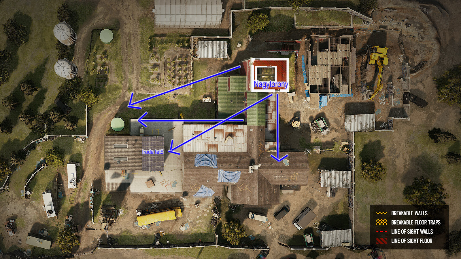A legfelső emeletről és a tetőről csak azért készítettem az alábbi képet, hogy lássátok: a map átalakulásával igen sokat kedveztek a spawn killereknek. A toronyból ugyanis rengeteg helyre rá lehet látni, amit illusztráltam néhány nyíllal. Igen, tudom ez nem teljesen fedi a valóságot, hiszen ezekből az ablakokból jóval több helyre rá lehet látni, sőt még több ablak is rendelkezésre áll ehhez.