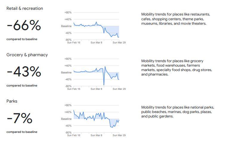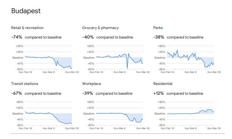 A piacok, élelmiszerboltok és gyógyszertárak látogatottsága 43%-ot zuhant, ezzel együtt pedig a munkahelyi jelenlét is 32%-kal csökkent a február 26 előtti időszakhoz képest. A parkok látogatottságán már sokkal kevésbé látszik az esés, ezekre a helyekre ugyanis mindössze 7 %-kal járnak kevesebbszer az emberek. A lakóhelyek környékén tartózkodás pedig 10 %-kal nőtt ez idő alatt.