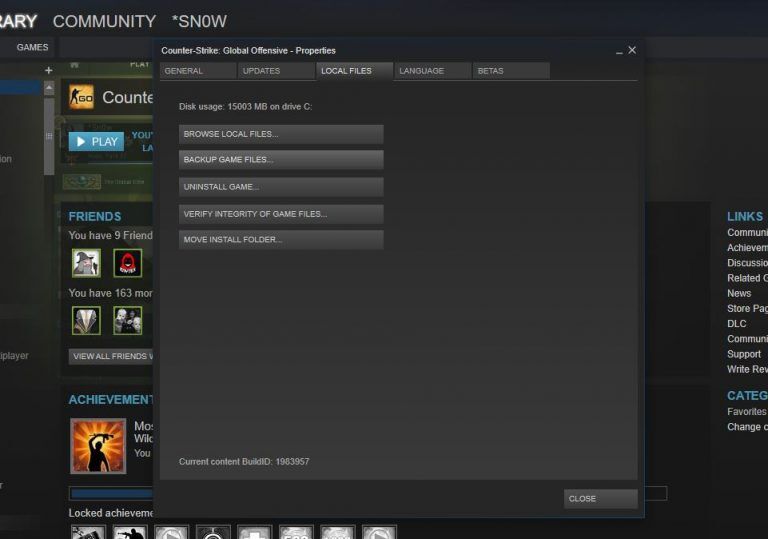 Steam könyvtár megnyitása, majd a CS:GO megkeresése. Jobb egérgomb a CS:GO ikonjára/Tulajdonságok (Properties). A fenti fülek közül a Helyi fájlok (Local files), azon belül pedig a Játék épségének ellenőrzése (Verify Integrity of game files).