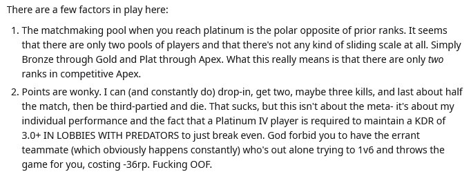 Hiszen egy Platinum játékosnak, ahhoz hogy egyáltalán ne veszítsen RP-t, legalább 3-as K/D arányt kell hoznia a meccsen, akár Apex Predator szintű játékosok ellen is. Ha ugyanis ez nincs meg, jön a mínusz RP.