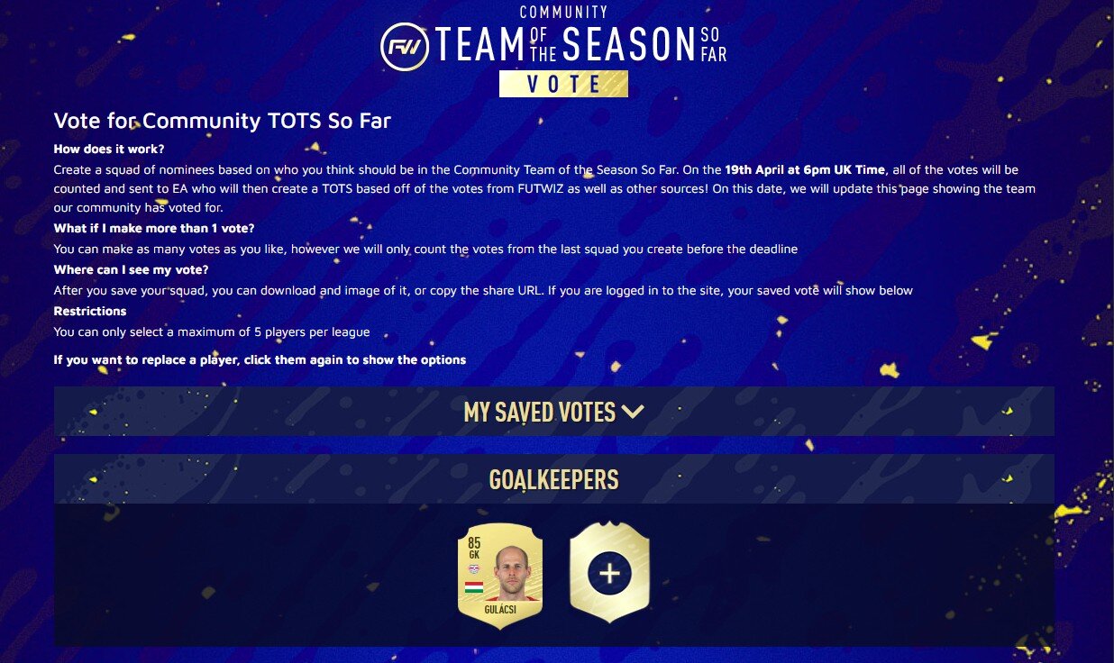 A FIFA két leghíresebb közösségi oldalán, a FUTWIZ-en és a FUTHEAD-en választhatjuk ki kedvenceinket. Azok a játékosok, akik a legtöbb szavazatot kapján,  Community TOTSSF lappal fognak gazdagodni.