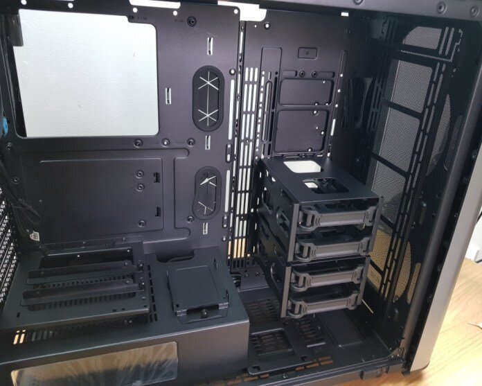 Miután az edzett üvegablakot eltávolítjuk a ház főkamrája tárul fel előttünk. Nem meglepő, hogy mindenfajta alaplapot képes befogadni köztük az E-ATX típusúakat is. A ház elején négy darab 88,9 milliméteres merevlemeztartó található, amelyek pozícióját szabadon állíthatjuk, vagy akár ki is vehetjük. A tápegységet a Thermaltake GT alján helyezték el, aminek a tetejére pluszba egy SSD tartót is felszereltek. Gyárilag nem tartalmazza a tápegységet, ezt nekünk kell beszerezni. Ez maximum 220 milliméter hosszú lehet. Mindenesetre érdekes húzás a gyártó részéről, hogy a teljesen edzett üvegablakkal körülvett házban a PSU-ra is felszereltek egy pici ablakot.