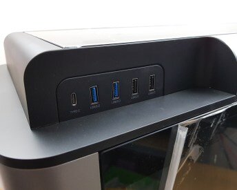 A kialakítása tökéletesen szimmetrikus, ami nem csak a gépház oldalára terjed ki, hanem a felül elhelyezett IO panelekre is. Az egyik oldalán a bekapcsoló gomb mellett, a HDD ledet, reset gombot, fejhallgató és mikrofon bemenetet találjuk meg. A másik oldalán a panelnek 5 darab USB bemenet található, amiből 2 darab 2.0-ás, 2 darab 3.0-ás és egy C típusú.