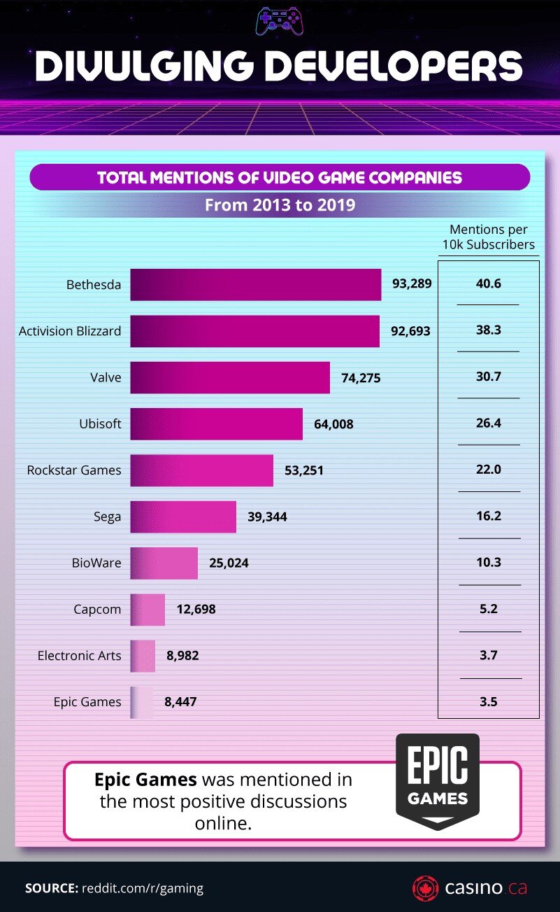 Lényegében megvizsgálták, hogy az r / gaming aloldalon a közösség 2013 óta hányszor említette a különböző stúdiók neveit, játékok címeit, platformokat. Az stúdiók között az első helyre a Bethesda került, több mint 93 ezer említéssel.