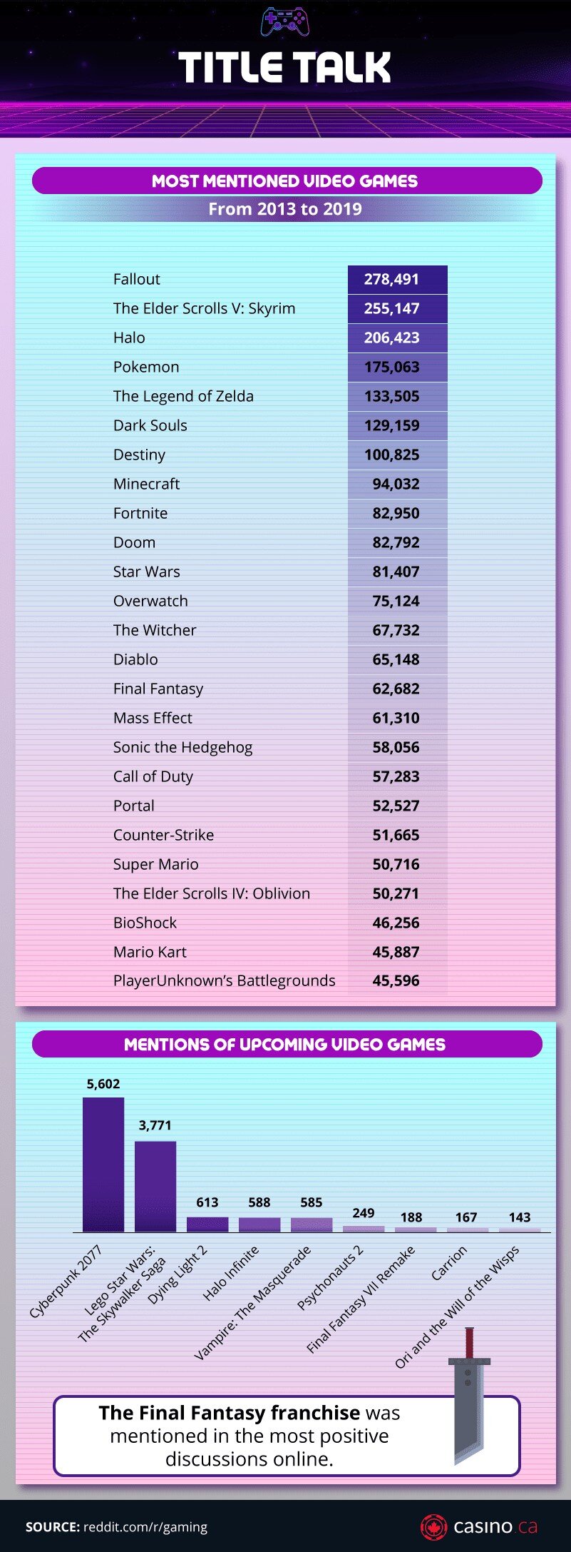 Bethesda népszerűsége miatt a Fallout volt a Reddit legnépszerűbb címe, azt követi a Skyrim majd a Halo és a Pokémon. Persze nem biztos, hogy a Fallout éppen pozitív értelemben került szóba. The Legend of Zelda, a Dark Souls és a Destiny szintén nagyon népszerűek voltak a beszélgetésben. A közelgő címek közül a legtöbbet eddig a Cyberpunk 2077-ről beszéltek a Redditen.