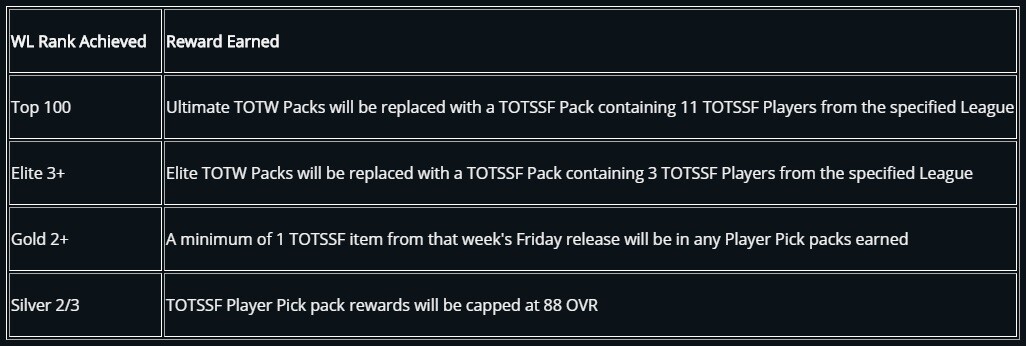 Már a most hétvégén induló WL-ben is érvényes az új szabály, miszerint a TOTW és TOTW Moments lapok helyett Red TOTSSF lapokat szerezhetünk a packokból.