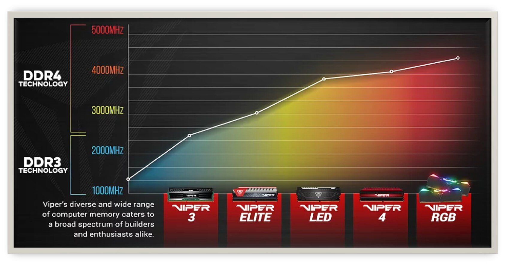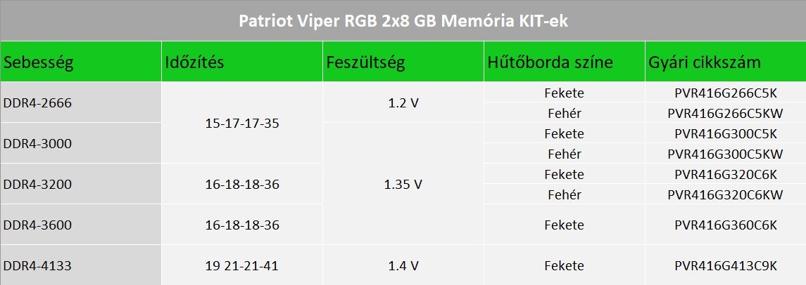 A Patriot viszonylag óvatosan nyúl az RGB-s memória modulokhoz, így a kezdeti felhozatal a Viper RGB DDR4-es modellekből a közepestől a magas órajelű modulokig terjed, ami DDR4 4133 MHz-et jelent 1.4 V mellett, ami kicsivel a más gyártók „extrém” ajánlatai alatt helyezkedik el. Eközben a Viper RGB testesíti meg egyértelműen a high-en kategóriáját a Patriot felhozatalának, mind stílusát tekintve, mind pedig teljesítményben.