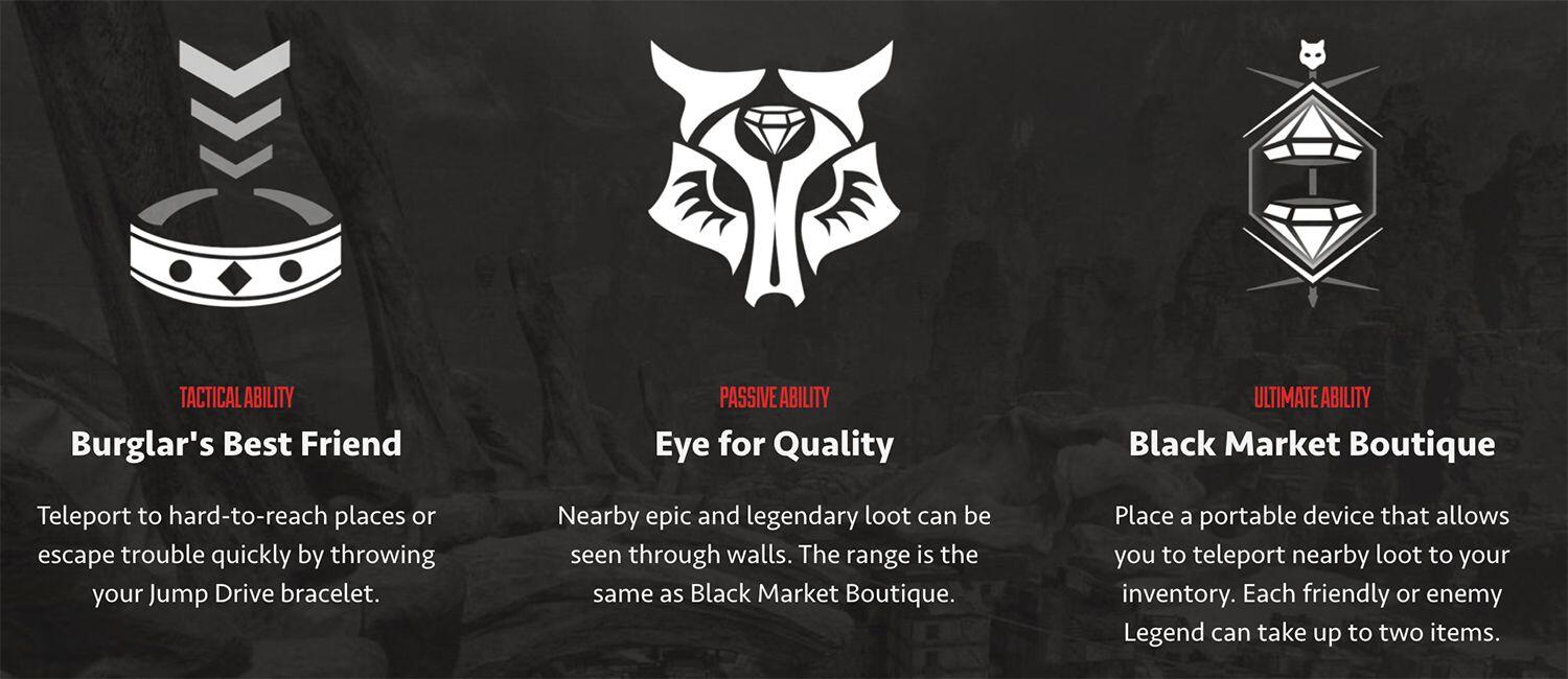A Black Market Boutique lehetővé teszi, hogy egy eszközt elhelyezve Loba és társai az inventory-ba teleportálja a környéken található lootot. Minden csapattárs akár két elemet is magához vehet így.