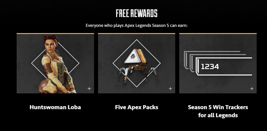 Csakúgy, ahogy a tavalyi szezonban, három ingyenes jutalom érkezik azok számára, akik csupán azzal tisztelik meg a fejlesztőket, hogy játszanak a játékkal. Loba érkezésének alkalmából tehát mindenki megkapja a Huntswoman skint, valamint 5 Apex Packot és Season 5 Win Trackert minden karakter számára.