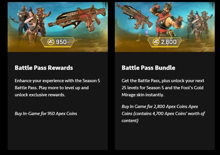 A Battle Pass 950 Apex Coinba (AC) kerül, de befizethetünk 2800 AC-t is, hogy átugorhassuk az első 25 szintet. Ha valódi pénzben számolunk, az alap Battle Pass kb. 3000 forintra jön ki, míg a BP Bundle nagyjából 6500-ra.