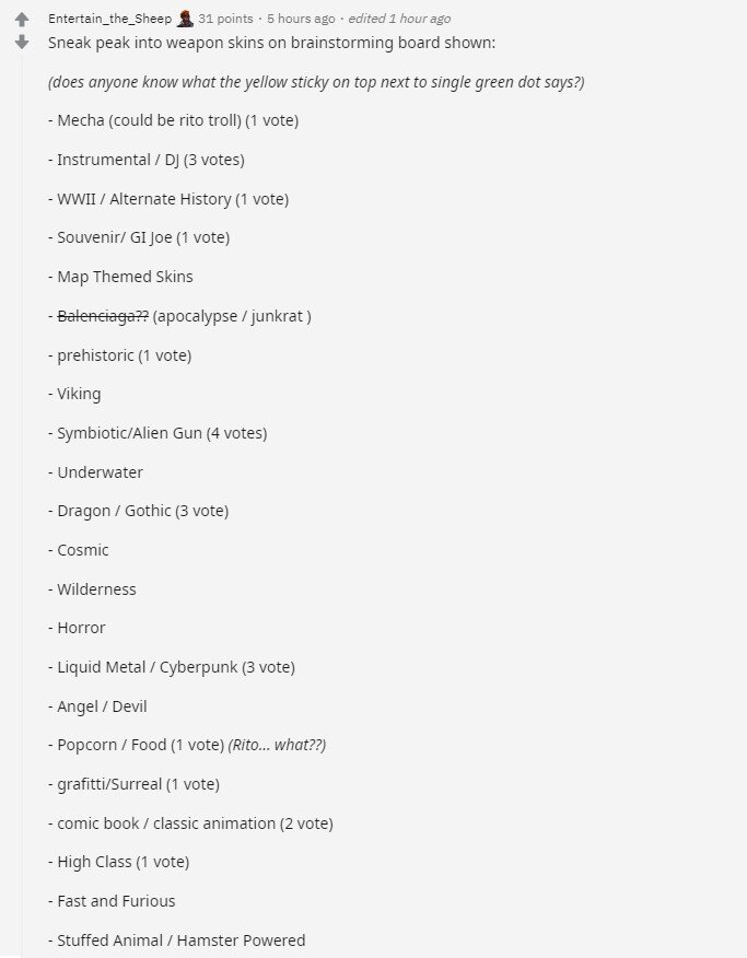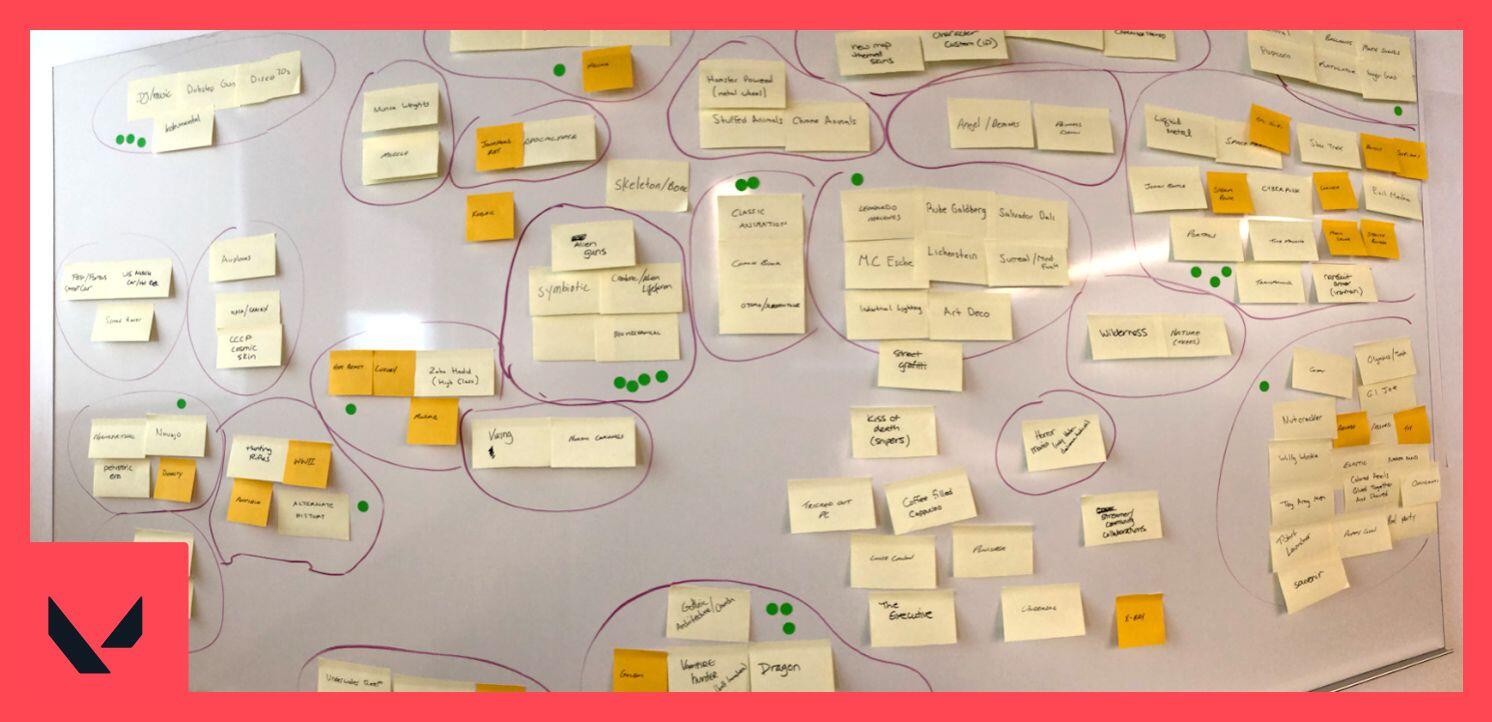 A posztban feltűnik egy fotó, ami az egyik megbeszélés után készülhetett. Egy táblát láthatunk rajta, ami telis tele van ragasztva cetlikkel. A cetlikre különböző tematikákat írtak a fejlesztők, zöld pöttyökkel pedig házon belüli szavazást rendeztek. A VALORANT közösség úgy gondolja, hogy ezzel a képpel kívánja jelezni a Riot, hogy milyen jellegű tartalmak érkezhetnek a közeljövőben: