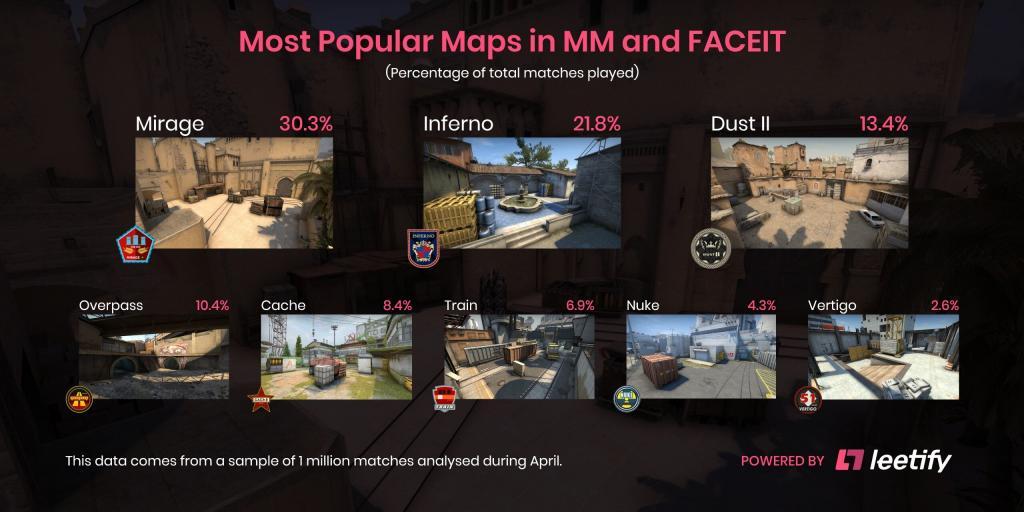 Április hónapban 1 millió meccset vettek mintaként a fenti ábra elkészítéséhez a leetify emberei. A statisztikákból tisztán leolvasható, hogy Mirage, bár sokan kritizálják, magasan a legkedveltebb pálya, a második Infernóra is közel 10%-ot ver. Dust 2, bár egybeolvadt a CS-vel, mindössze a meccsek 13.4%-nak ad otthont.