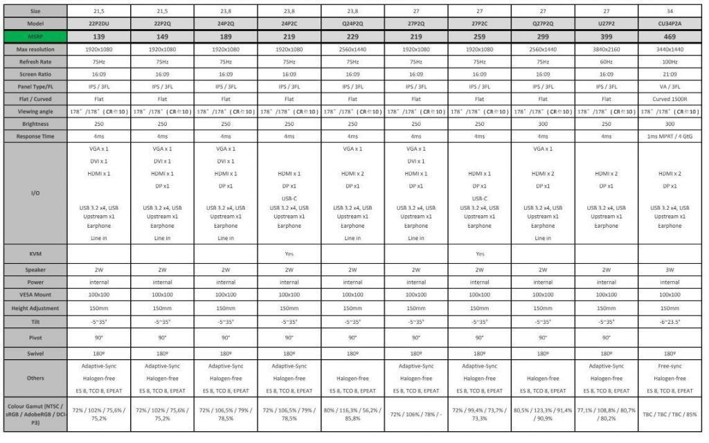 Az ívelt (1500R) VA-panellel ellátott ultraszéles 34 hüvelykes CU34P2A monitort kivéve minden kijelző lapos IPS-panelt kapott. Ezek biztosítják a színek valósághű megjelenítését, a széles színskálát és a kiváló betekintési szögeket (178/178°), amelyek ideálisak tartalomgyártáshoz és a szerkesztéshez. Egyes modellek (24P2C és 27P2C) USB-C csatlakozóval is rendelkeznek, hogy egyetlen USB-C kábel segítségével kijelző-, adat- és tápcsatlakozást biztosítsanak a mobileszközökhöz. A modellekbe integrált KVM-kapcsoló lehetővé teszi, hogy a felhasználó két (USB-C-n és USB-hub uplinken keresztül csatlakoztatott) számítógép billentyűzete és egere között váltson.