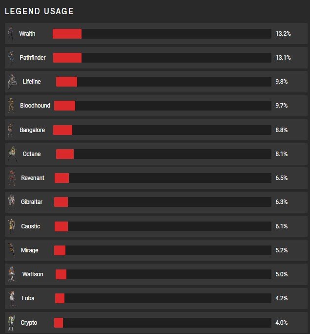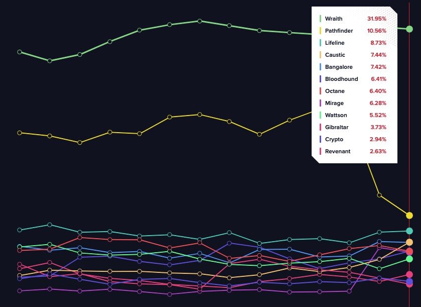 A DreamTeam.gg statisztikái szerint jelenleg Wraith a legnépszerűbb karakter mind a PC, mind pedig a konzolfelhasználók körében. Pathfinder és a Lifeline a második és a harmadik helyen áll, 10,56%-kos és 8,73%-kos választási aránnyal.