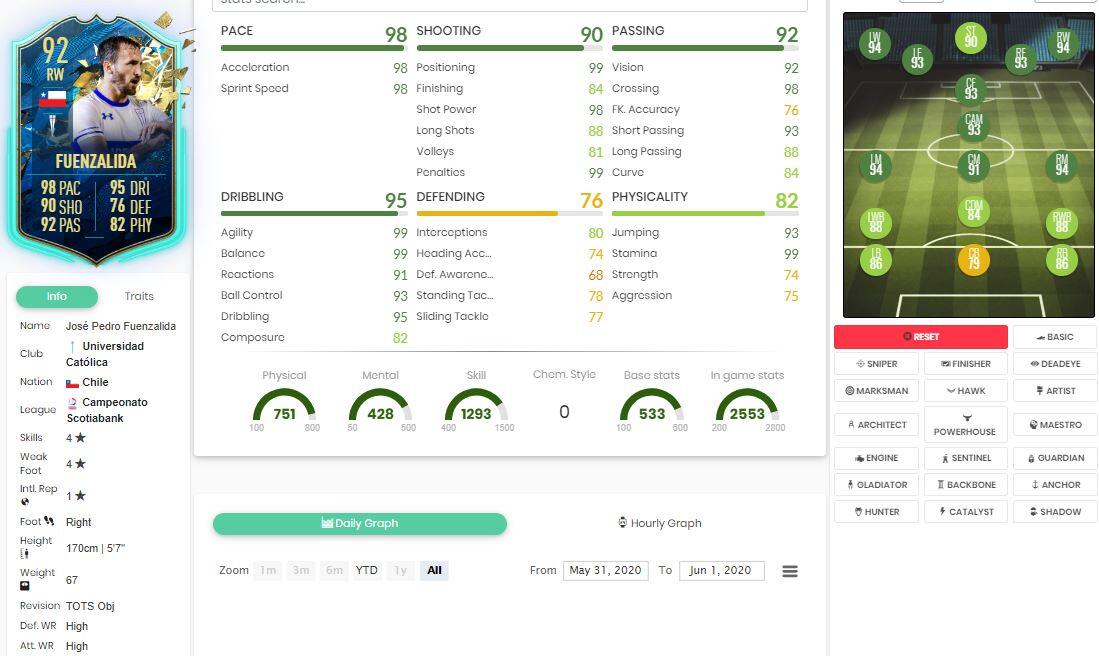 A chilei játékos lapja egyáltalán nem néz ki rossznak. 98-as Pace, 99-es Positioning. A Finishingen mindenképp kell húzni, de ezt chemyvel lehet orvosolni. Beadásai erősek, rövid passzai se rosszak. 99-es Balance és Agility kombó. Egyedül a Composure, a Strength és Aggression statja alacsony, de hát na. A pályán fogja bírni, hiszen 99-es Staminát kapott 35 éves kora ellenére. Fuenzalida megszerzéséhez elég SB meccseket játszanunk, szóval nagyon könnyű dolgunk van.