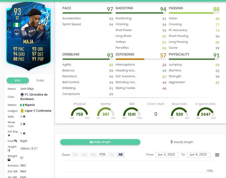 Maja kártyája nem kerül sokba. Nagyjából 90 ezer zsetonból összetehető, ami azért egy 93-as lapért nem rossz ár, de nézzük is, hogy milyen értékekkel rendelkezik ez a lap.