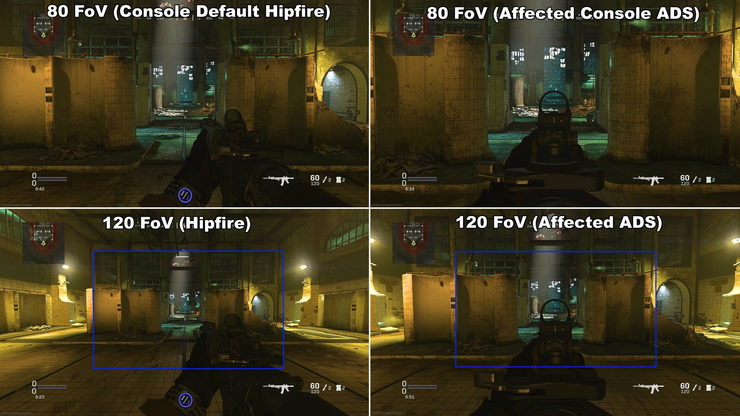 Ennek oka, hogy teljesen más a látható tér (field of view) konzolon és PC-n. Utóbbi azt jelenti, hogy általánosságban mekkora területet látunk be a világból, miközben egy irányba nézünk. Minél szélesebb a látómező, annál többet látunk a térből. Így könnyebben vagy kevésbé észlelhetők az ellenfelek is.