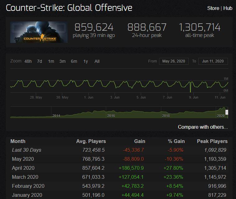 Amíg áprilisban 857 604 fő volt átlagosan a Valve szerverein, addig ez a szám májusra közel 89 ezerrel csökkent, az utóbbi 30 napra vetítve pedig további 45 ezer fővel lett kevesebb. Ha jobban megfigyeljük 2 hete még 900 ezer – 1 millió fő környékén tetőzött a csúcsjátékosszám (felső grafikon). Viszont az utóbbi napokban már „csupán” 800-900 ezer fő környékén tetőzött az egyidejű játékosszám.