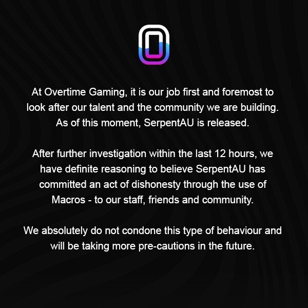 Nem telt el sok idő, egy 12 órán át tartó vizsgálat után azonnal megszüntették az együttműködést SerpentAU-val, aki így már hivatalosan is csalónak minősült. Egy ilyen eset pedig nem tesz jót egyetlen esport klub pedigréjének sem, mennie kellett az ausztrál videósnak.