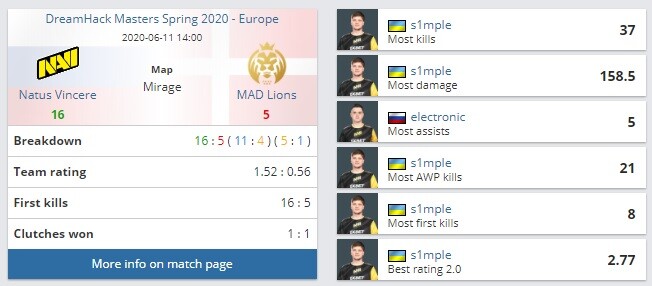 A Na’Vi 16:5-re nyerte a mapot, és a rövid pálya, valamint a +29-es K/D együttesen 2.77-es HLTV Ratinget érdemelt ki. Ez a teljesítmény s1mple eddigi legdurvább mapja, eddig 2.4 fölé se jutott még soha, pedig voltak már nagy vadulásai ez előtt is.