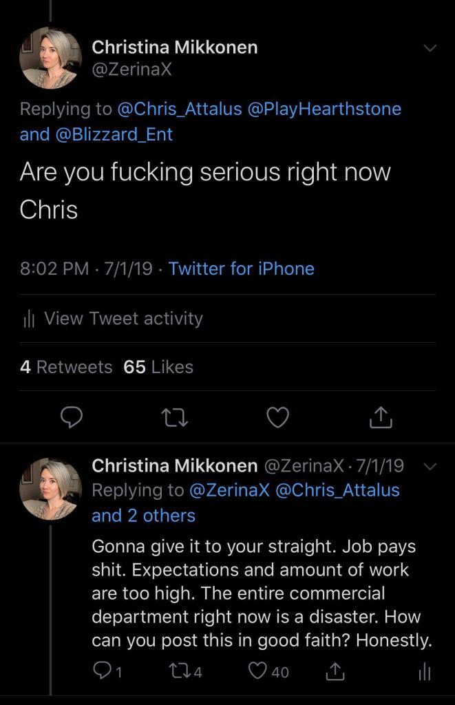A Blizzard egy álláshirdetéses posztja alatt indította be Zerina a rakétáit, felhívva a figyelmet arra, hogy a cégen belüli helyzet minimum katasztrofális és amúgy a fizetés is nevetséges.