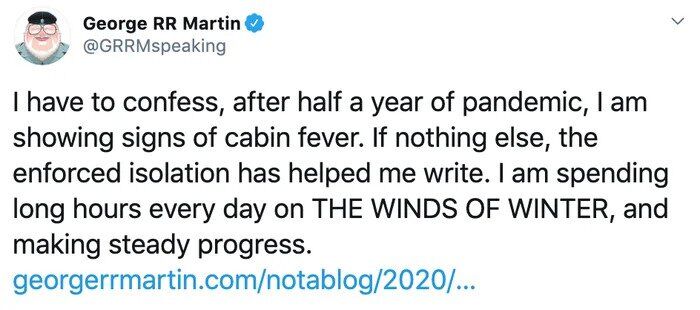 „Az elszigetelődés segített nekem az írásban, naponta több órát dolgozom a The Winds of Winteren, és jól haladok vele” – írta George R. R. Martin.