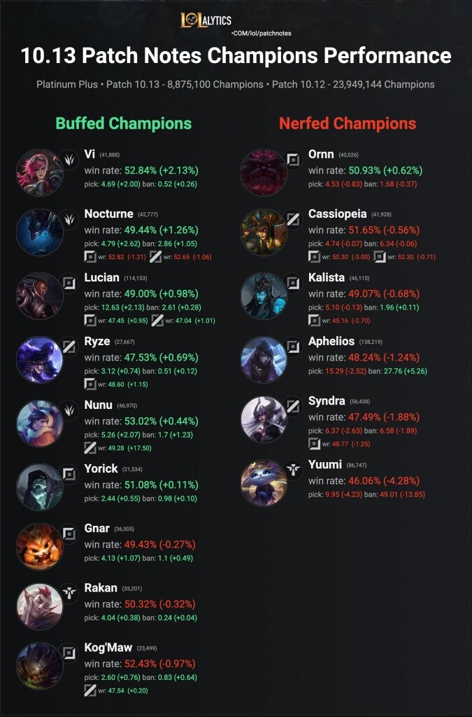 A nerfek is úgy alakultak, ahogy az el volt tervezve. A pick arány szépen bezuhant, miközben kevesebb meccset is hoznak le a gyengült karakterek. Ez alól egyedül Ornn kivétel, a felső ösvény mumusa a gyengítés ellenére is több meccset nyer, mint korábban.