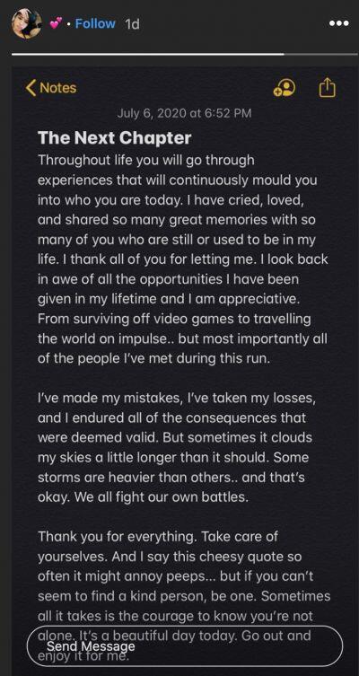 Instagramon „Következő fejezet” címmel osztott meg egy történetet, ami egyben a búcsúlevele is volt. Ebben összefoglalta az eddigi életét és megköszönte mindazoknak, akik mellette álltak jóban, rosszban.