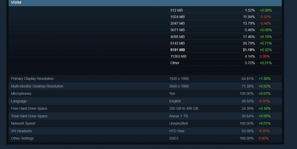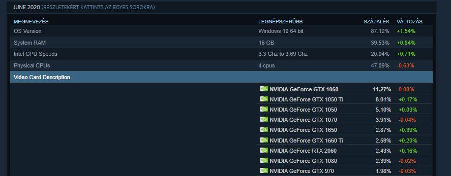Hiába az RTX széria, a leggyakoribb videókártya továbbra is a GTX 1060, amiből 3 és 6 GB-os verzió is készült, viszont a Steam kizárólag a GPU-t vizsgálja. A második helyen az 1060 kis testvére, a GTX 1050 TI áll, amit a GTX 1050, majd a GTX 1070 követ. Az első AMD-s hardver az RX 580, amit a Steam játékosok 1,98%-a használ.
