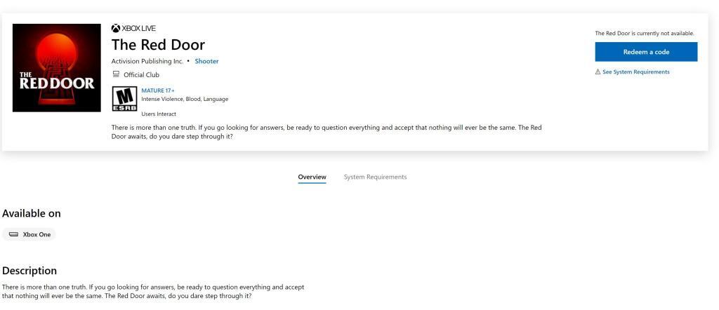 Amint az a képen is látható, a The Red Door nevű játék egyelőre csak kulcs ellenében elérhető, sőt, azóta már láthatatlanná is tették az Xbox Store-ban. Kiadóként az Activision jelenik meg, a kép pedig az a logó, amit már hetekkel ez előtt is láttunk a Warzone fájljai között.