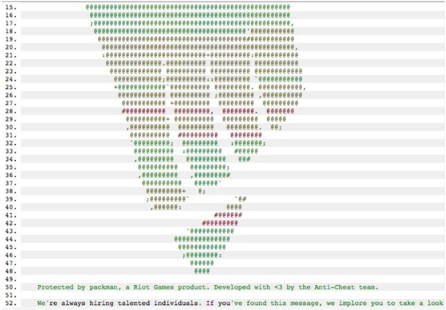 Az üzenet tartalma egy felkérés, melyben a Riot Games a hackerek segítségét kéri a csalók elleni harchoz. A cég logójának ASCII rajzos változata alatti üzenet egyértelműen fogalmaz: