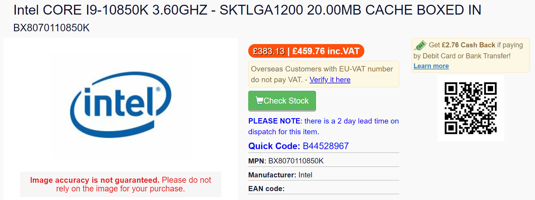 A Cyclotron és a LambdaTek webáruházában tűntek fel az újdonságok. Az előbbi oldalon 472 euróért (~166 ezer forint), az utóbbin 459 fontért (~178 ezer forintért) megy elővételben. A végleges nettó ára várhatóan 449 euró, azaz 158 ezer forint körül fog alakulni, miközben az i9-10900K nagy testvér 220 ezer forint körül kapható.