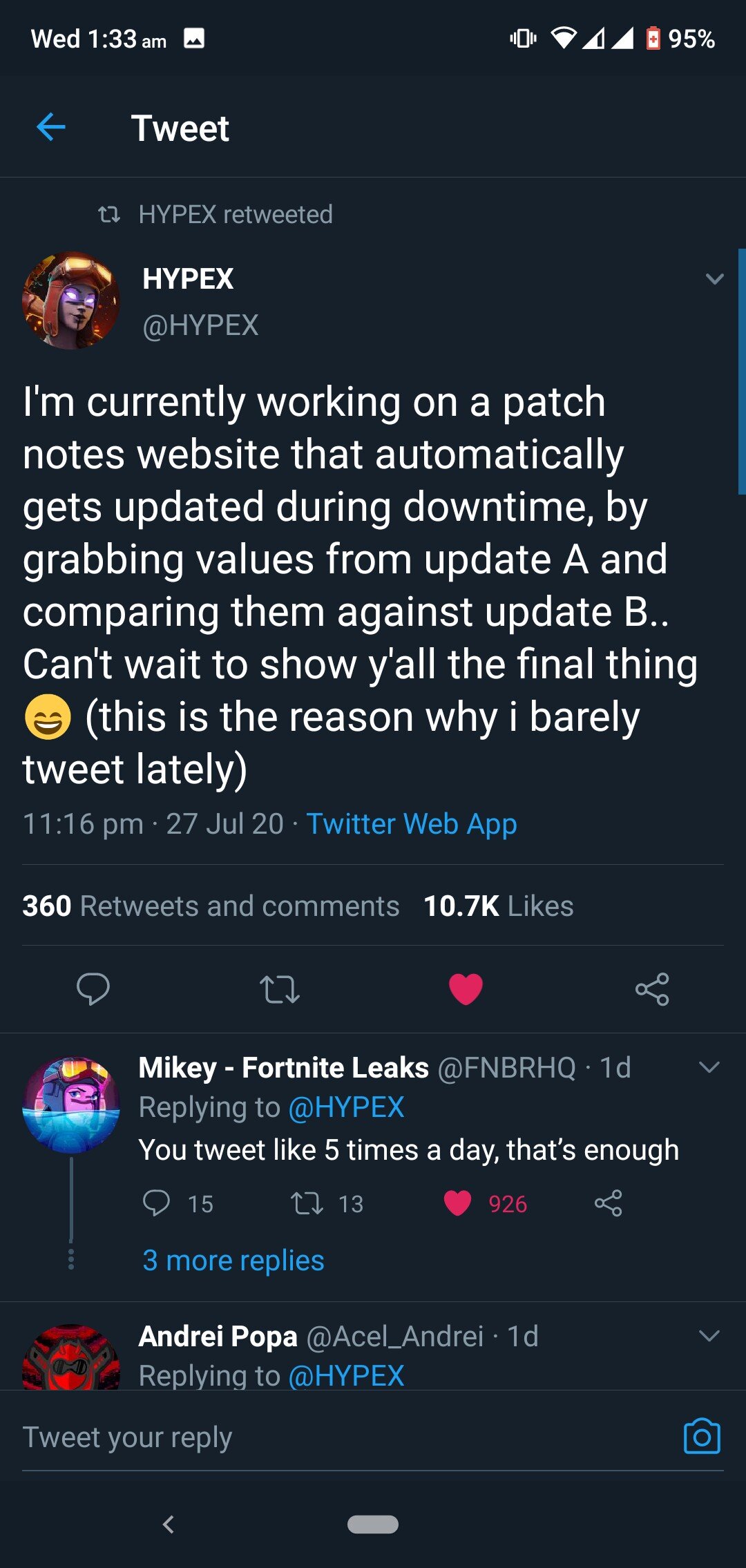 Elmondásai szerint az adatbányász mostanában nem volt túl aktív a közösségi média felületein, ugyanis keményen dolgozott egy oldalon, ami a jövőben sokak hasznára válhat. Hypex készít egy összehasonlító weboldalt, ami a szerverkarbantartás során fel fogja mérni, hogy az előző Fortnite verzióhoz képest hol és miben különbözik az új. Természetesen, ha értékekről beszélünk (fegyver sebzés, struktúra életerő, stb.) azt is listázni fogja az oldal.