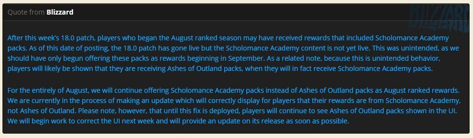 A Blizzard hivatalos üzenetben írt az esetről, s egyértelmű hibának könyvelték el. Ugyan a 18.0-ás frissítés már elérhető, a Scholomance Academy csomagoknak és kártyáknak csak a hét második felében kellene befutniuk papíron. Vagyis az ajándék csomagok között sem szabadott volna felbukkanniuk.