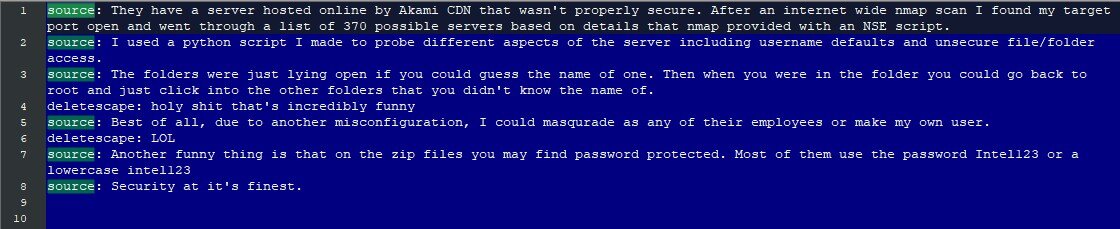 A ZDNet azonban megkapta Kottmann beszélgetésének másolatát a forrással, melyben az állítólagos hacker szerint az adatokat az Akamai CDN-n tárolt nem biztonságos kiszolgálón keresztül szerezte be, nem pedig az Intel Resource és a Design Center-ből.