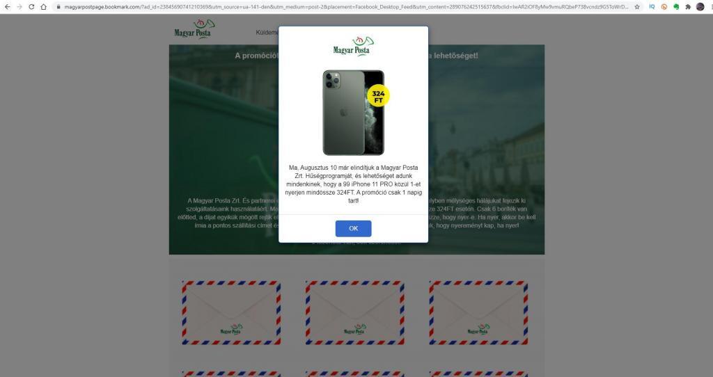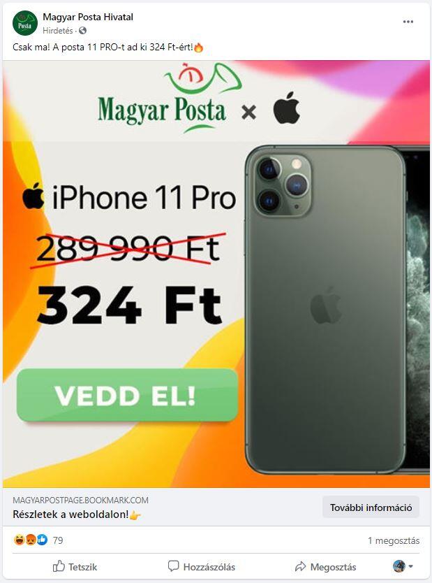 Sajnos amióta létezik internet, azóta vannak csalók. Napjainkra pedig már meg sem tudunk lepődni azon, amikor egy jól hangzó hirdetésről kiderül, hogy nem igaz. Ezúttal ismét a Magyar Posta nevével éltek vissza: a csalók iPhone 11 Prókat „árultak” mindössze pár száz forintért. Már az is gyanús lehetne, hogy a hirdetésben egy 289 990 forintos ár szerepel, miközben az iPhone 11 Pro hivatalosan 399 000 forinttól indul, na de hogy valamilyen oknál fogva ez most akciósan 324 forintért elhozható? Na ez már igazi tündérmese.