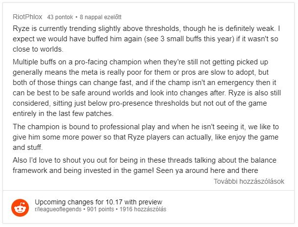 „Ryze jelenleg egyértelműen gyenge. Úgy sejtem, hogy normális esetben már erősítettünk volna rajta, viszont most túl közel járunk a Worlds-höz ahhoz, hogy ezt meglépjük.” – írta Riot Phlox a Redditen.