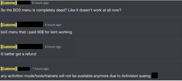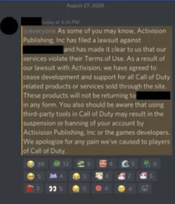 A csalást fejlesztő oldalnak saját Discord szervere is van, ahol hivatalosan bejelentették, hogy az Activision megkörnyékezte őket. A képernyőfotót MrTheRevertz osztotta meg Redditen a közösséggel. A pereskedés miatt egyébként le kellett állítaniuk minden folyamatban lévő fejlesztést és még a szolgáltatásokat is be kellett fagyasztaniuk.