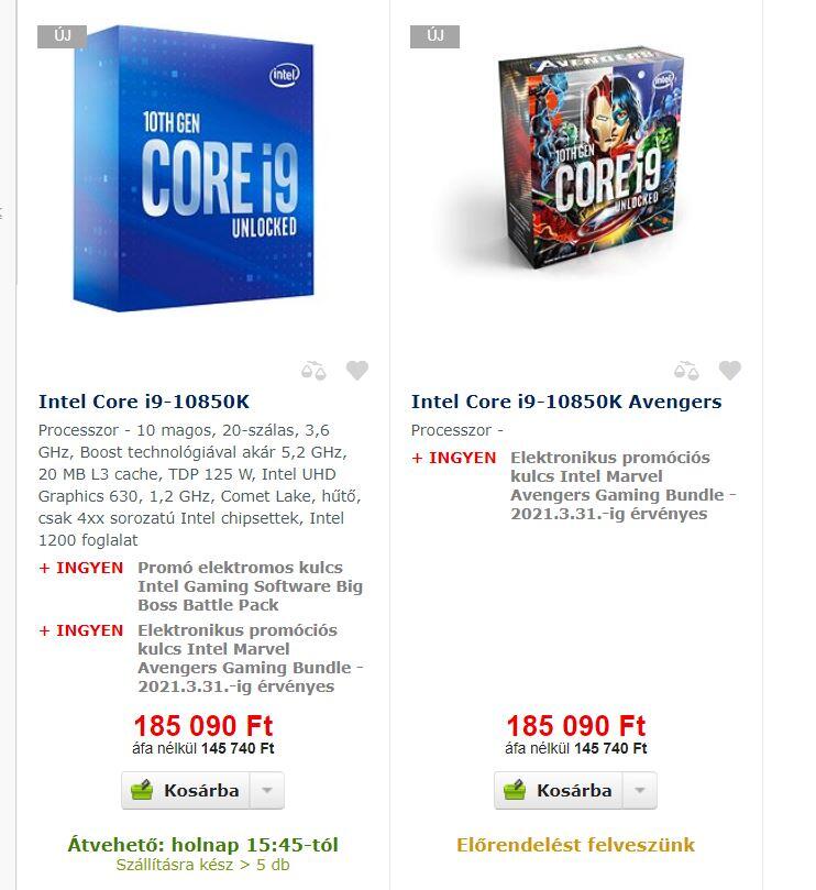 Jó hír, hogy már hazánkban is kapható az Alza kínálatában. Itt az i9-10900K 213 ezer forintért vihető, amíg az újonnan érkezett i9-10850K csupán 185 ezer forintos árcédulát kapott, ráadásul épp tart az Intel Bosszúállók akciója, ami az előzetes híresztelések ellenére tartalmazza a Marvel’s Avengers-t, így már mindjárt nem olyan borzasztó vétel.