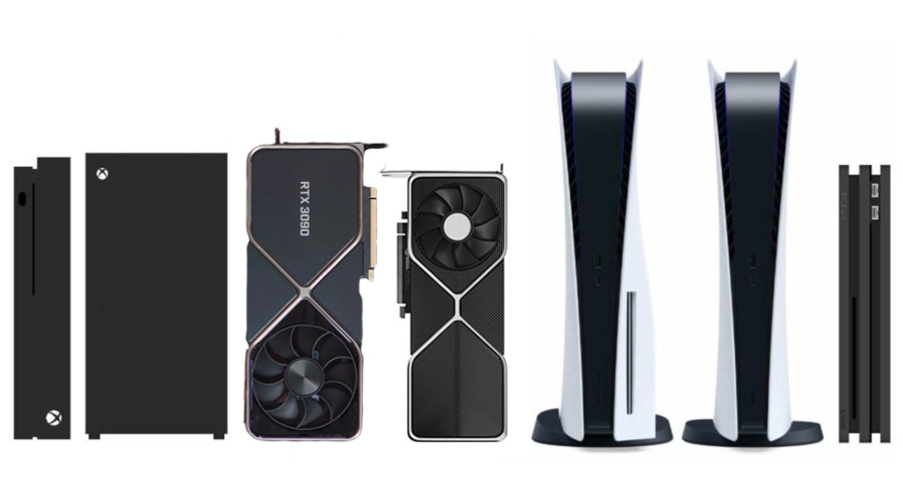 Shen Lee a Twitteren osztott meg egy képet arról, hogy a kártyák méreteik alapján hogy festenek a konzolok mellett. Pontosabban az NVIDIA GeForce RTX 3090 és GeForce RTX 3080 Founders Edition kártyákat látjuk az Xbox One X, Xbox Series X, PlayStation 5 és PlayStation 4 mellett.