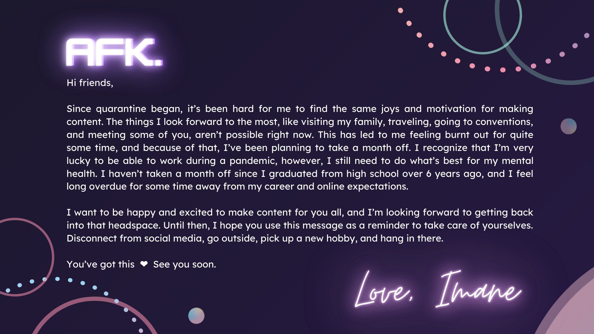 „Több mint 6 éve nem voltam szabadságon. Ezt egy ideje esedékesnek érzem. Boldog és izgatott szeretnék lenni, ha tartalmat készítek. Alig várom, hogy visszatérhessek” – írta augusztus elején az AFK nevű bejegyzésben.