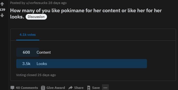 A két válaszlehetőség tehát a „tartalom” és a „külső” volt. Ha Pokimane meglátja a kutatás eredményét, csalódottan veheti tudomásul, hogy a rajongóinak döntő többsége az utóbbit választotta. A kutatás szerint mintegy 3,5 ezren szavaztak a külsőre. Ehhez képest csak 608 rajongó mondta, hogy a tartalom miatt követi a streamet.