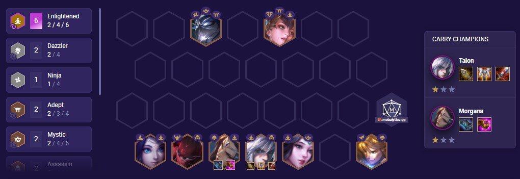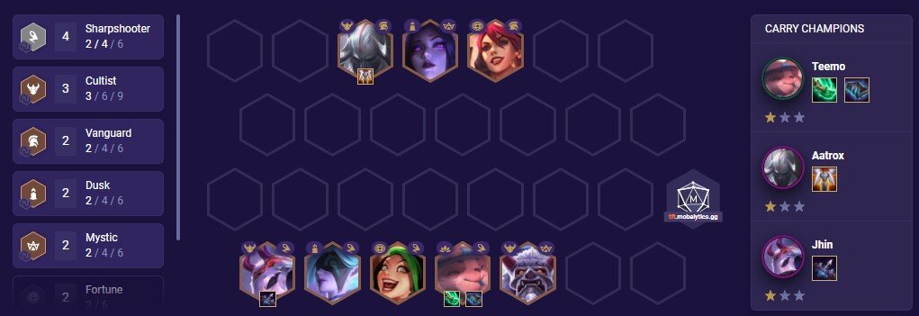 A másik lenyűgöző kombináció a Moonlight egységek köré épül. Ha ügyesek vagyunk, akkor létrehozhatunk egy 4 csillagos carry karaktert. A mechanikájukat már korábbról ismerhetjük, a legkisebb szintű egységet eggyel magasabb szintre emelhetjük. Ám ha mindenki 3-as szintű, akkor a legtöbb tárggyal rendelkező egység négyesre emelkedik a Moonlight harcosok közül. Itt ajánlatos Aphelios-t megpakolni tárgyakkal, ugyanis ilyenkor a TFT-ben is megvalósul a „200 Years” mém.