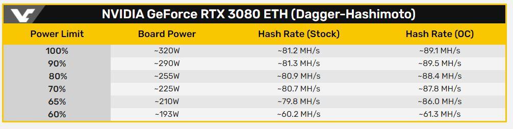 Az olvasók kérésére nézte meg a Videocardz, hogy mégis mit tud NiceHash alatt az új RTX 3080, az eredmény pedig igen meglepő lett. Egyrészt szinte elhanyagolható volt a kártya bányászteljesítménye 100% és 80%-os power limit (TDP) mellett, így 255 watt fogyasztás mellett is ugyanolyan jól lehet bányászni, mintha teljes gőzzel, 320 wattot fogyasztva menne a kártya. Legjobb esetben pedig 89,5 MH/s-os eredményt sikerült elérniük, ehhez némi tuningot is alkalmaztak, alapórajelen pedig 81,3 MH/s volt a kártya teljesítménye.