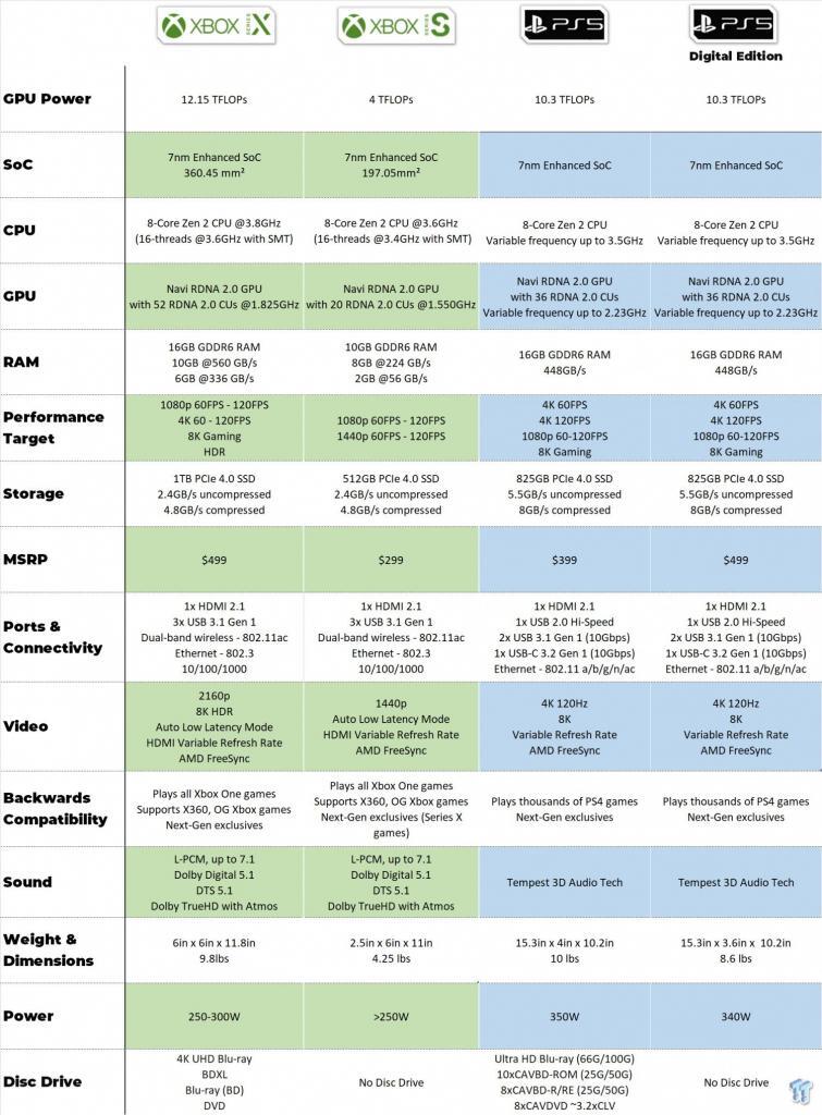 A két PS5 esetén egy 36 számolóegység (CU) teljesít szolgálatot 2,33 GHz-es órajelen, így 10,28 TFLOPs-os elméleti számítási teljesítményre képes maximum. Szemben az Xbox Series X-et 52 (CU) számolóegységgel látták el, amelyek 1,825 GHz-en üzemelnek, így pedig 12,15 TFLOPS-os elméleti számítási teljesítménnyel rendelkezik. Ott van viszont az olcsóbb Xbox Series S, amit csupán 20 számolóegységgel láttak el, ennek megfelelően a számítási teljesítménye is megáll 4 TFLOPS-nál.