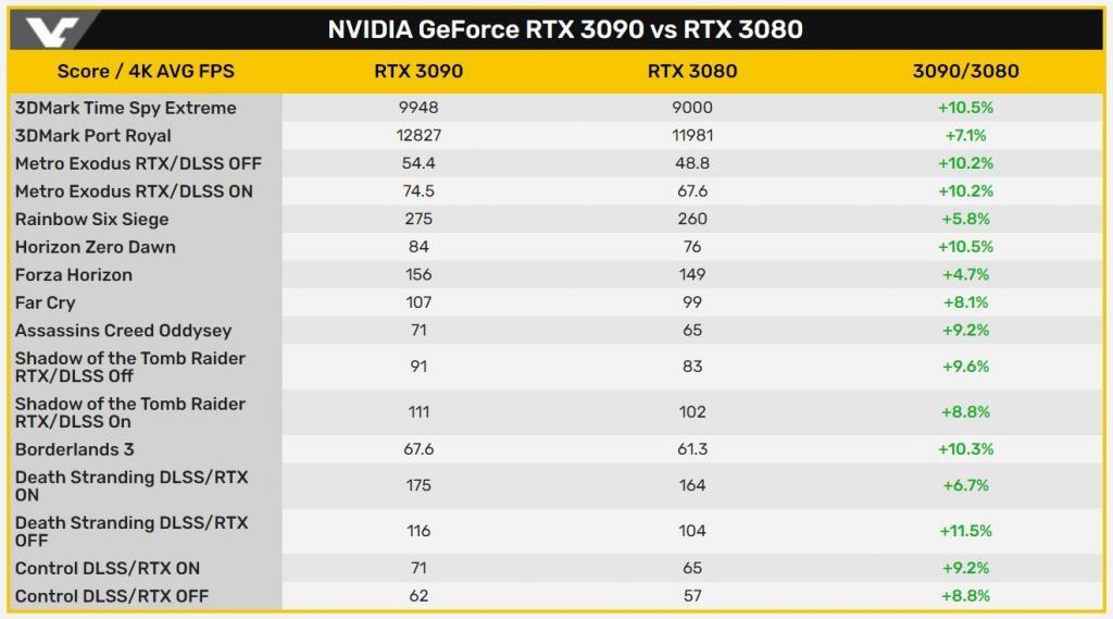 Nos, a mai napon már elkezdtek kikerülni az első 8K-s RTX 3090 videók, ezzel együtt pedig egy teszt is napvilágot látott, amiben az RTX 3080 és RTX 3090 közötti teljesítménykülönbségre is fény derült. Ebből nem kell persze egyből messzemenő következtetéseket levonni, elvégre egy kínai tesztlabor korai driverekkel mért eredményeiről beszélünk, ettől függetlenül érdekes a teszt végeredménye.