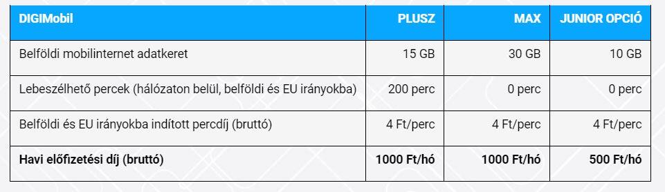 A DIGIMobil PLUSZ díjcsomag havi 1000 forinttól lesz rendelhető, amely 15 gigabájtnyi belföldi mobilinternetet, 200 perc belföldi és EU lebeszélhetőséget foglal magában. A rendelkezésre álló percek felhasználása után a belföldi és EU mobilhálózatba indított hívás díja bruttó 4 Ft/perc.