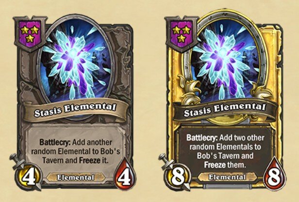 - Miután kijátszottunk egy Elemental egységet, a Bob’ Tavernben felbukkanó Elementalok +1/+1-et kapnak a játék végéig. Az arany +2/+2-t ad.