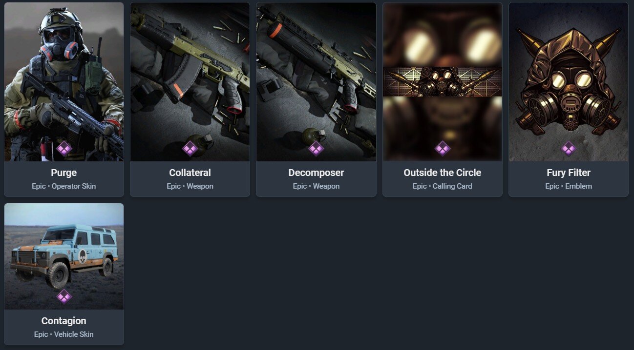 A humoros névvel megáldott csomagba két blue print, egy jármű skin, valamint egy Purge operátor skin is helyet kapott. Utóbbi egy igazán lenyűgöző szettben szeli az utcákat, a koronavírus idején pedig jól fog jönni az a maszk is. Az előbb felsorolt tartalmak mellett egy Calling Card és egy Emblem is a csomag részét képezi.